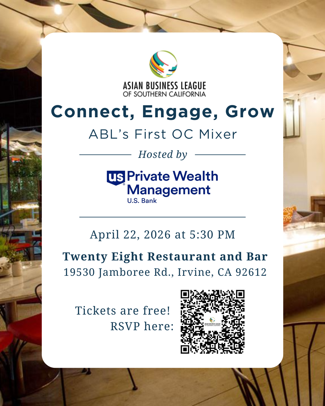 The Asian Business League of Southern California is coming to Orange County! Join us for a mixer hosted by US Bank Wealth Management at Twenty Eight on April 22nd from 5:30-8:30 PM! Get to know our organization and network with our members over drinks and food. Scan the QR code to RSVP!